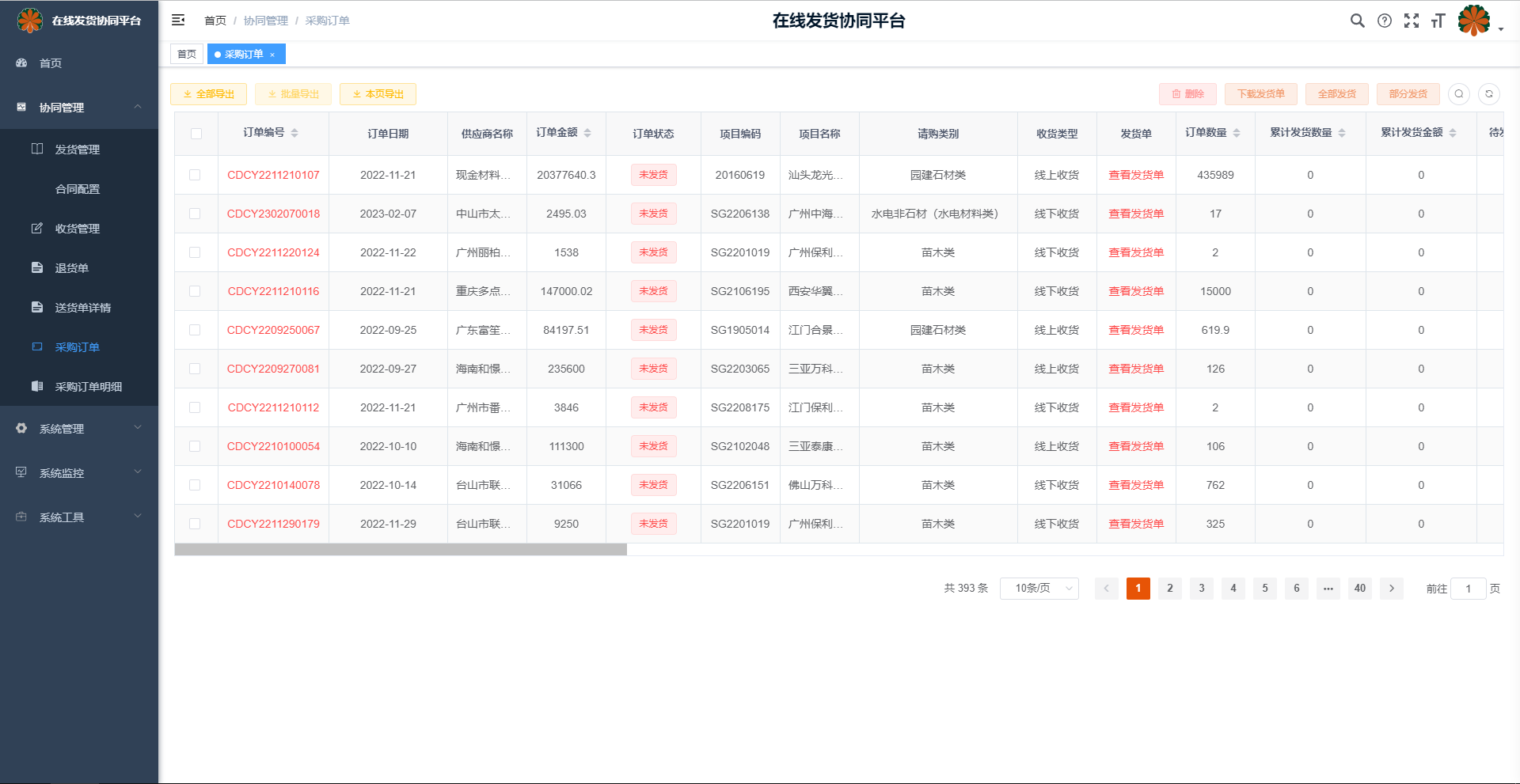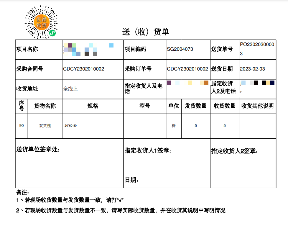 核心业务流程为:NC审核采购订单--协同系统读取NC采购订单--公众号/小程序消息推送(推送规则、推送模板)--供应商后台/小程序查看采购订单进行发货(在采购订单上按钮发货(数量带出,可修改)--协同系统确认发货并打印发货单--员工/项目经理登陆小程序查看发货单进行收货(扫收货单收货)--点击收货完成按钮时--生成最终收货单合同文件(收货单同步契约锁--契约锁短信通知供应商/客户/收货人进行签字--所有签字完成后--留存协同系统且可下载--同步收货记录到NC到货单--NC系统根据到货入库回写到采购订单到货数据;
