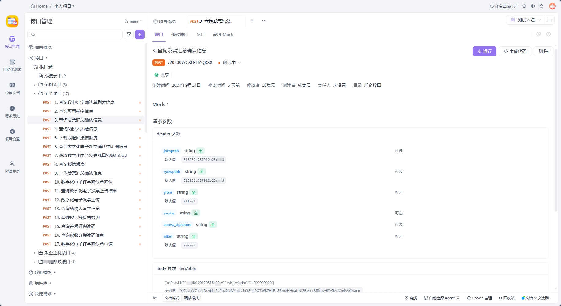 5.沙箱环境开通有72小时时限,需要在时限内完成全部场景测试,我们已为很多企业进行开通和测试上线。开票能力基础版接口能力我们已经在APIFOX中全部测试完毕,其他客户测试修改配置即可完成,如下图。